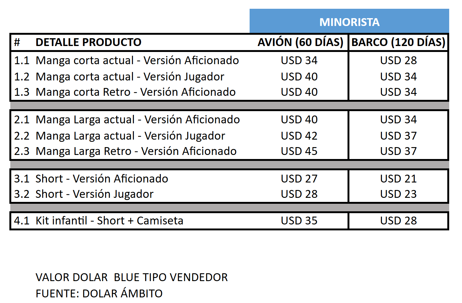 Nos ocupamos de traer al país ese producto en la versión, talle y personalización que tanto buscas. La demora promedio de esta vía ronda los 60 días vía aérea y 120 días vía marítima, que pueden verse afectados por factores externos como: